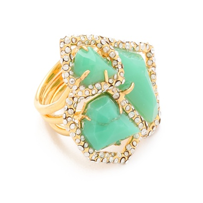 Play up your accessories with a candy colored turquoise ring from Alexis Bittar. With chrysoprase stones nestled into the Swarovski crystals, this gold stacked ring will be a gleaming addition to your jewelry box.