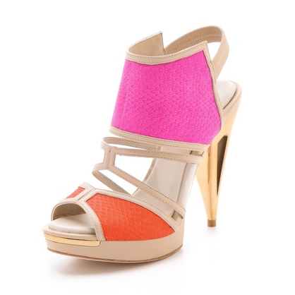 Fancify your feet with the color block sandals from BCBGMAXAZRIA. With panels of bright pink and orange colors over the vamp and ankle, these gold metallic-heeled sandals are a breath of fresh air for your shoe shelf.