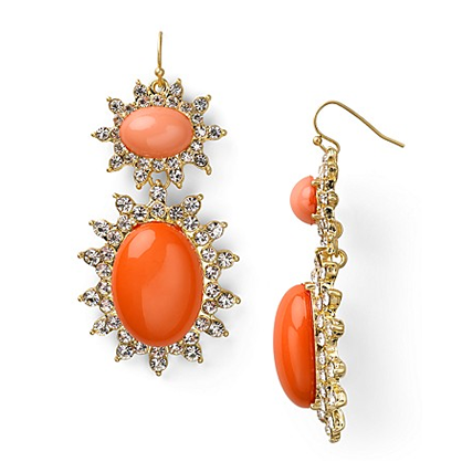 Pump up the candy color in your spring ensemble with some orange cabochon earrings from Aqua. The cute coral shade of the gems is brought to life by the touch of vintage glamour with the crystal sunburst setting.