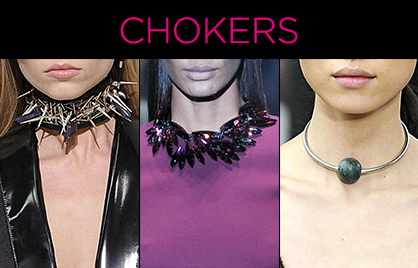 Collar necklaces have been popular for the last few seasons and the next iteration appears to be the emergence of choker silhouettes. There were many variations of this face-framing option, including African and Asian-influenced neck rings, modern minimalist designs, stacked high chains, floral motifs and rings with exotic skin breastplates.