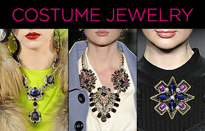 Costume jewelry looked as good as the real thing on Fall runways. Opulent and dramatic jewels appeared on handbags, belts and various necklines. Medium to giant-sized stones made quite the statement, whether in clear crystal or a rainbow of sapphire, emerald ruby, amethyst and topaz. Any of these pieces will add head-turning flair to the simplest of outfits.