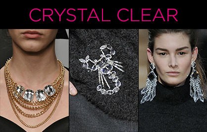 Colorless crystals offer a clear alternative to the other bold and colorful jewelry trends. We love the colorless option as it mixes well with other colors and nicely complements a print without competing with it. This is also a great way to try out some of the other jewelry trends for Fall, including giant chandelier earrings, chains/links and animal motifs.