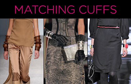 Generally, “matchy-matchy” pairings are frowned upon in fashion. This was definitely not the case for Fall 2013 as matching cuffs were worn on both wrists for maximum “Wonder Woman” impact. The options included supersized cuffs, simple bangles, stacked high bangles or even doubled-up cuffs.  The arm candy ranged from simple metals to those with giant jewels, ultra-wide leather, exotic bands, chain links and stud or buckle embellishment. Alternatively, mismatched pairs were also shown.