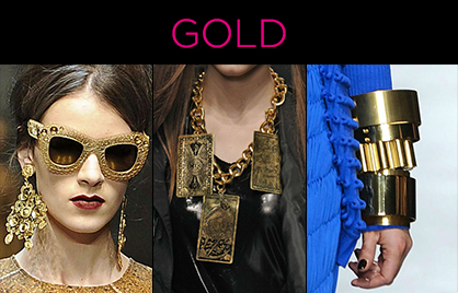 Gold was the metal of choice for Fall 2013 accessories. The metal permeated every classification from headbands to belts to bags and of course, jewelry. Looks included ornate Byzantine metalwork, bold chains, Baroque metal jewelry, hair accessories, modern cuffs and a wide variety of other styles and high-shine finishes.