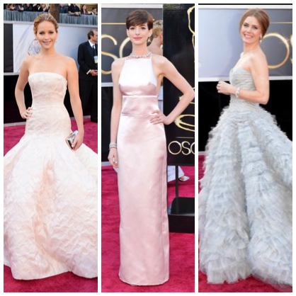 Spring is almost in the air. Best Actress winner Jennifer Lawrence radiated in the feminine blush Dior Haute Couture and Chopard jewels which dangled down her back. Amy Adams glowed in lavender Oscar de la Renta with full train, and Anne Hathaway showed her natural beauty in a pink satin column gown by Prada.