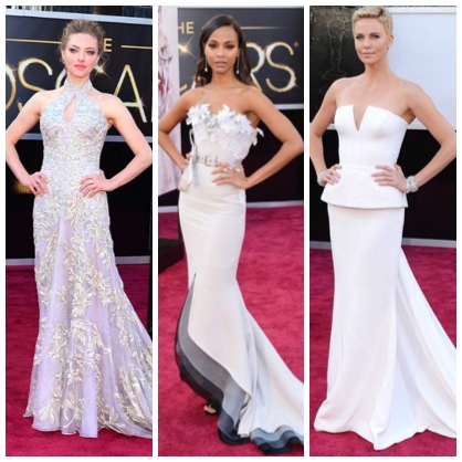 Nude, white and shades in-between were a color trend of the night; seen in structured, ethereal and strapless silhouettes. Amanda Seyfried dazzled in a custom organza gown with silver dragonfly embroidery by Alexander McQueen. Charlize Theron stole the show in a white hot Dior Haute Couture dress, while Zoe Saldana donned an edgier look in an Alexis Mabille Couture strapless gown, complete with petal details and dark scalloped bottom.