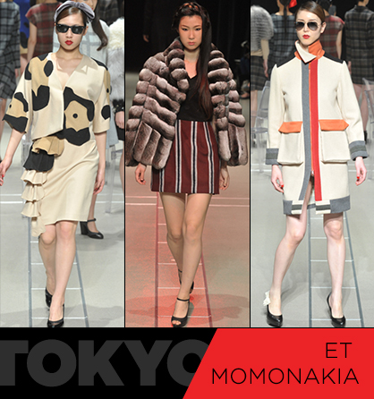 Design duo Joga Naoto and Tamaki Hiroto created a lighthearted presentation beginning with a series of tartan plaid dresses before moving into a series of ladylike looks. The Et Momonakia show presented colorblocking, animal prints and loud fur numbers that stole the show.